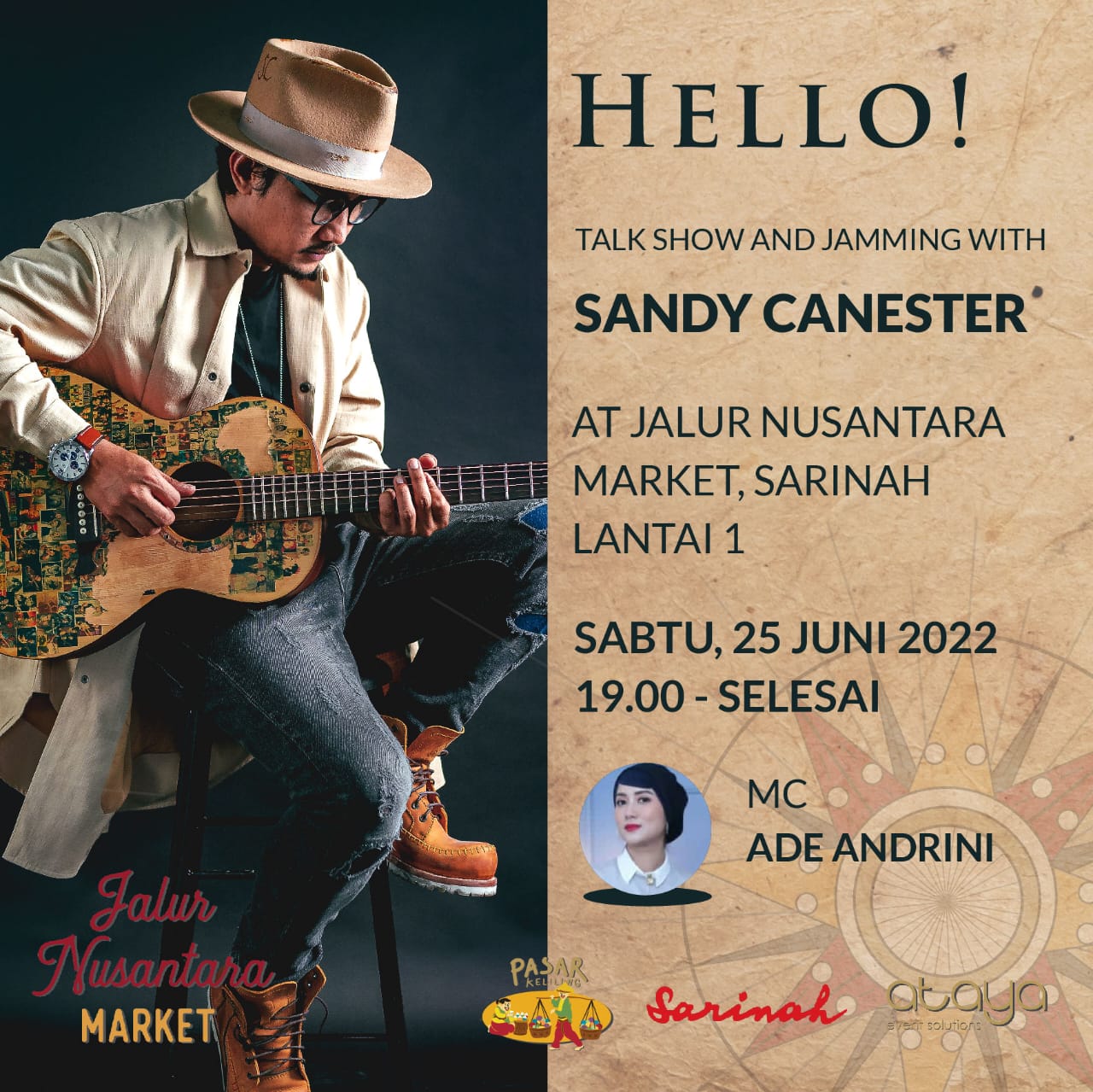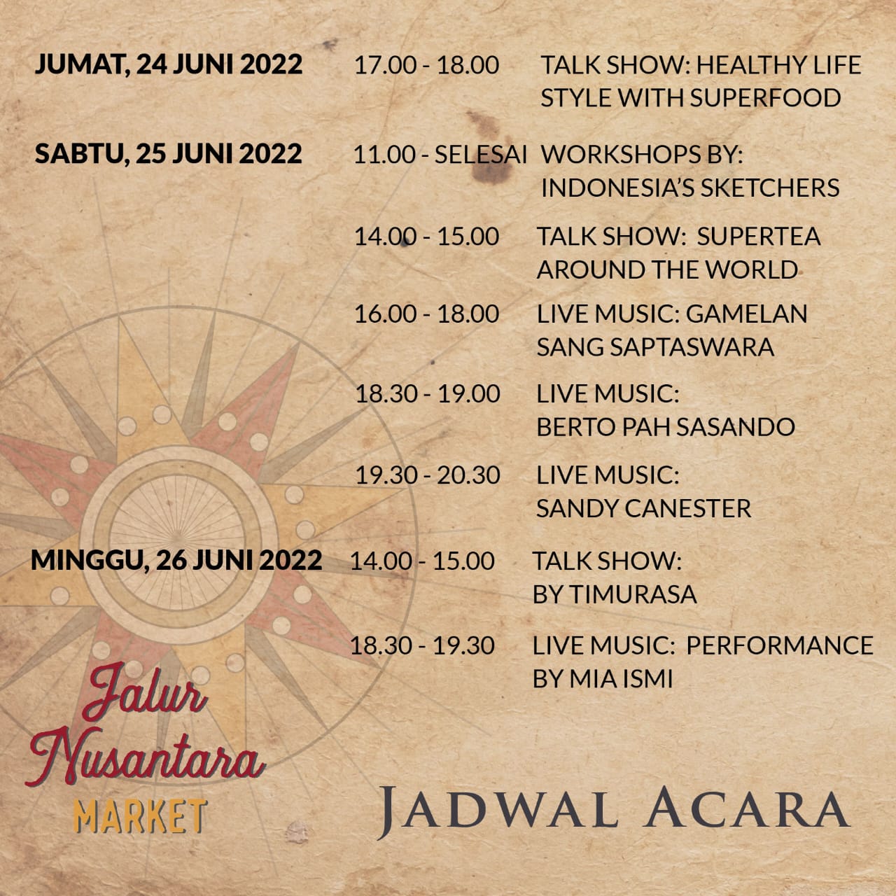 Salah satu pameran atau bazaar yang dapat anda kunjungi dalam waktu dekat, tepatnya tanggal 23-26 Juni 2022 ini adalah acara Jalur Nusantara Market di Sarinah, Thamrin, Jakarta. Pada acara ini anda akan bertemu produk-produk lokal berkualitas yang sudah dikurasi oleh Ataya Event dan Pasar Keliling selaku penyelenggara. Acara ini juga semakin menarik, karena tidak hanya produk dan kuliner lokal berkualitas yang dapat anda nikmati. Namun anda juga dapat mengikuti talkshow dari berbagai brand lokal berkualitas. Anda juga dapat menyaksikan penampilan berbagai seniman lokal Indonesia yang unik dan berkelas.